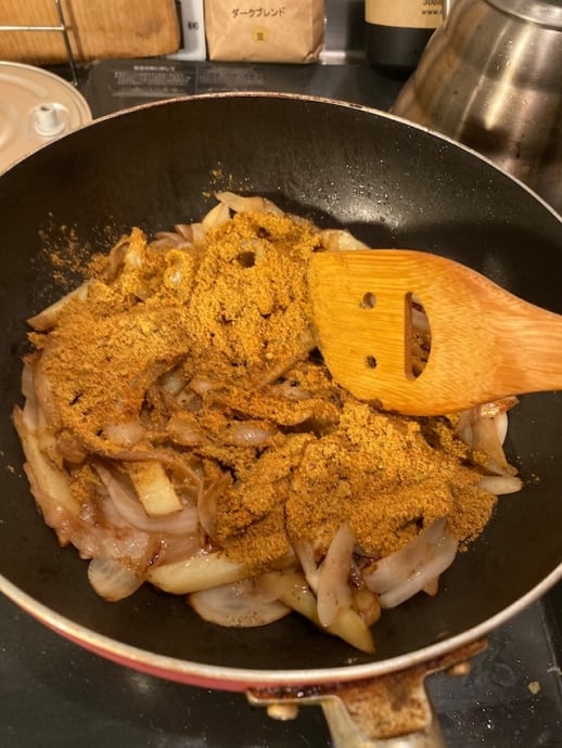 ・ニンニク、ショウガに火が通ったら弱火にし、パウダースパイスを入れて全体にかき混ぜながら弱火で炒める。