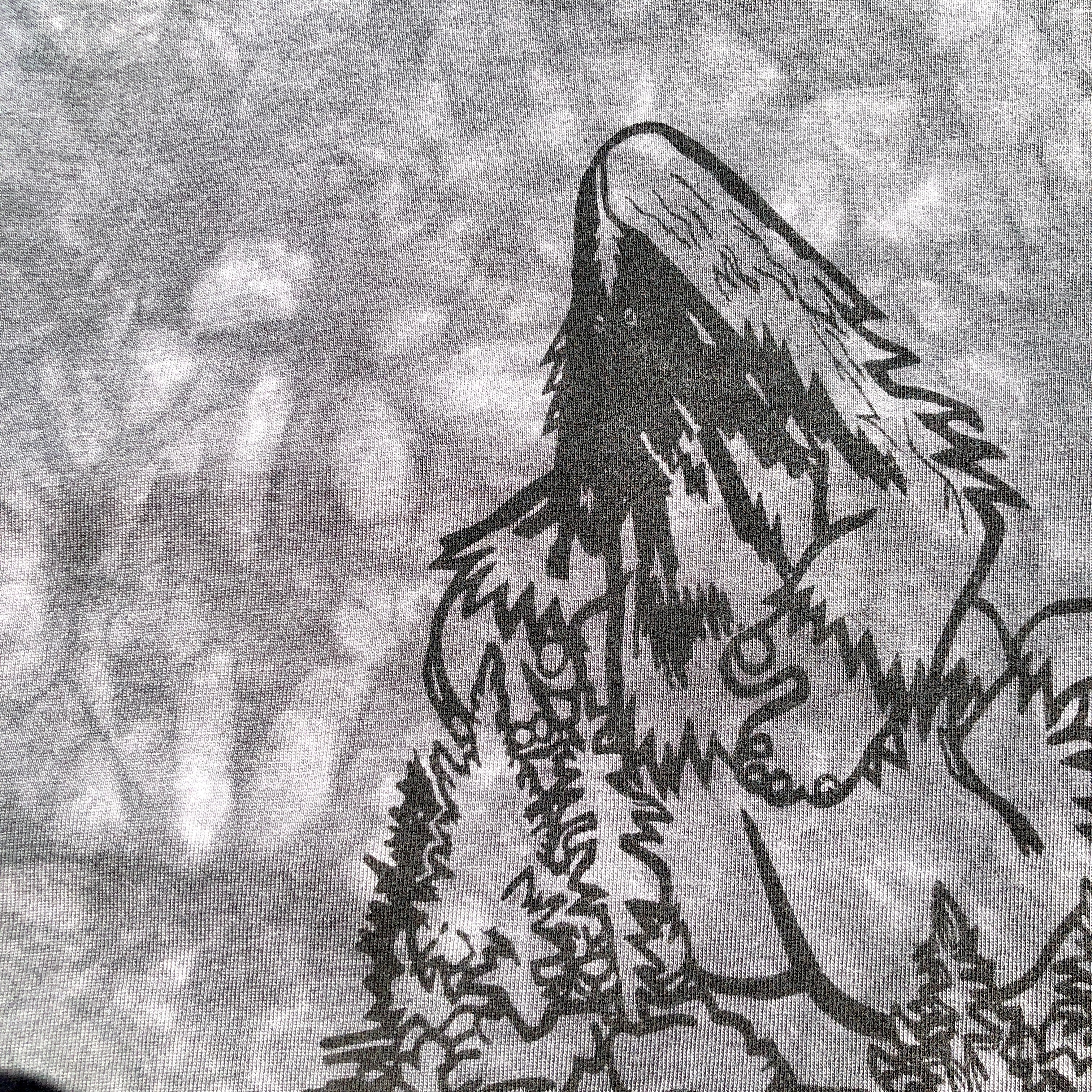 天竺素材を用いたボディは着心地も柔らかく深い色合いのタイダイ染めで仕上げられたボディもプリントとマッチする雰囲気。