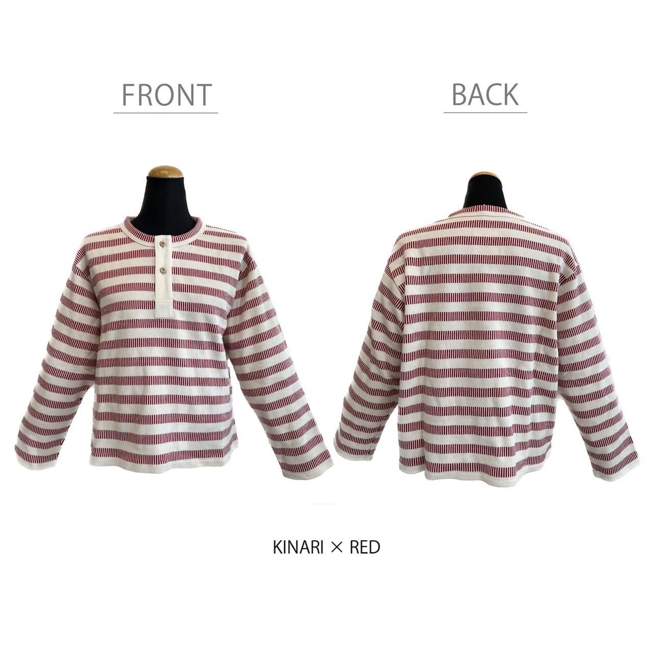 ヴィンテージ感のあるボーダー生地を使用したヘンリーネックは一枚で着ても様になります。